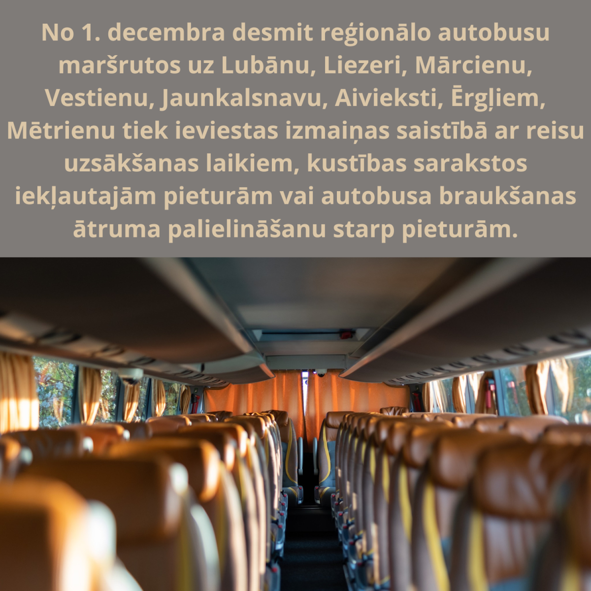 No decembra izmaiņas desmit reģionālo autobusu maršrutos Madonas novadā No šī gada 1. decembra desmit reģionālo autobusu maršrutos uz Lubānu, Liezeri, Mārcienu, Vestienu, Jaunkalsnavu, Aivieksti, Ērgļiem, Mētrienu tiek ieviestas izmaiņas saistībā ar reisu uzsākšanas laikiem, kustības sarakstos iekļautajām pieturām vai autobusa braukšanas ātruma... |