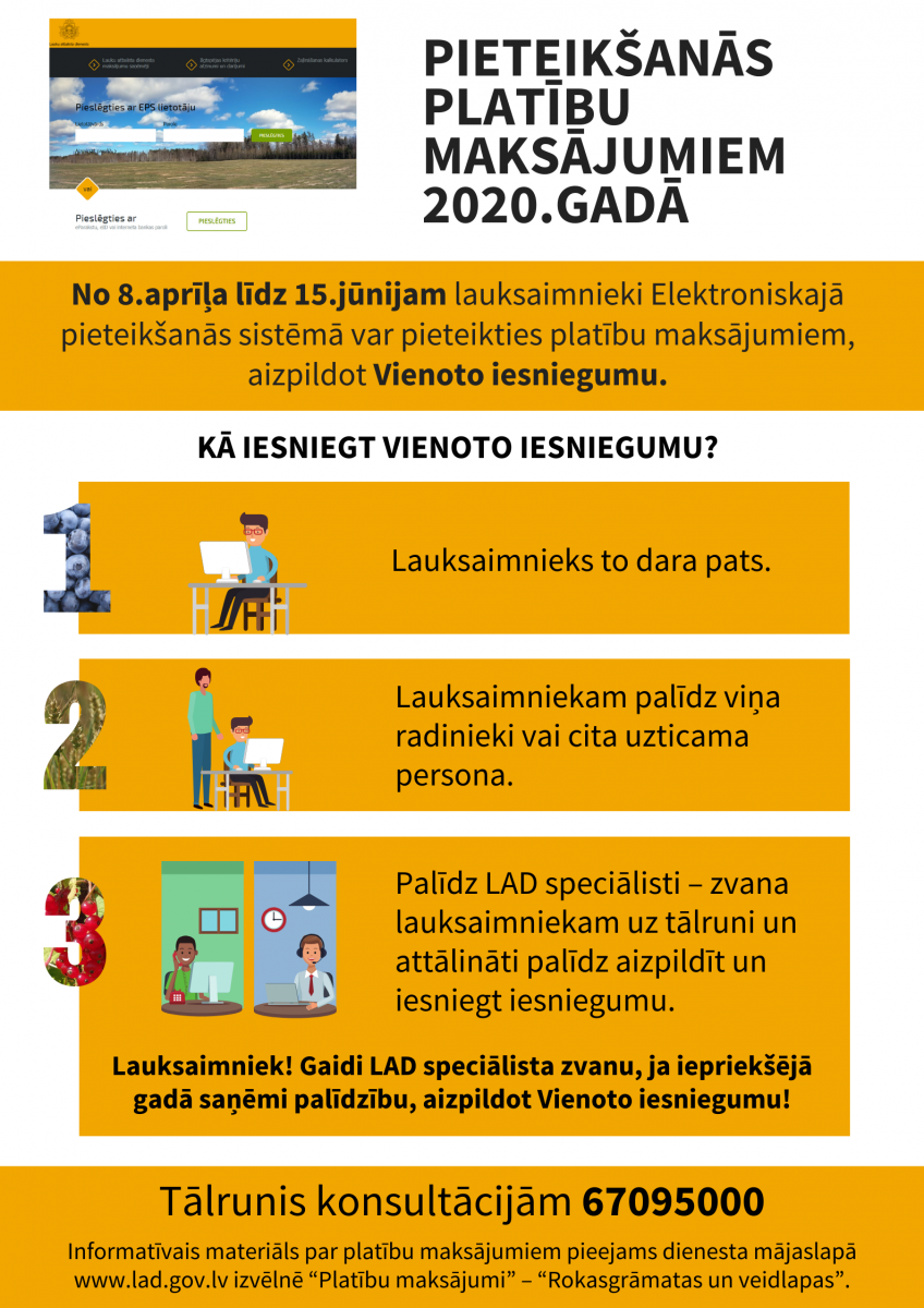 Konsultācijas par pieteikšanos platību maksājumiem var saņemt pa tālrunu 67095000.