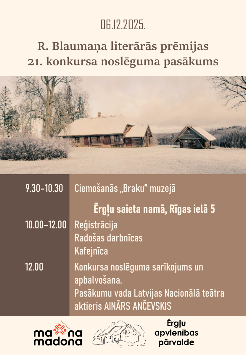 6.decembrī R.BLAUMAŅA LITERĀRĀS PRĒMIJAS 21.KONKURSA NOSLĒGUMA PASĀKUMS ĒRGĻOS