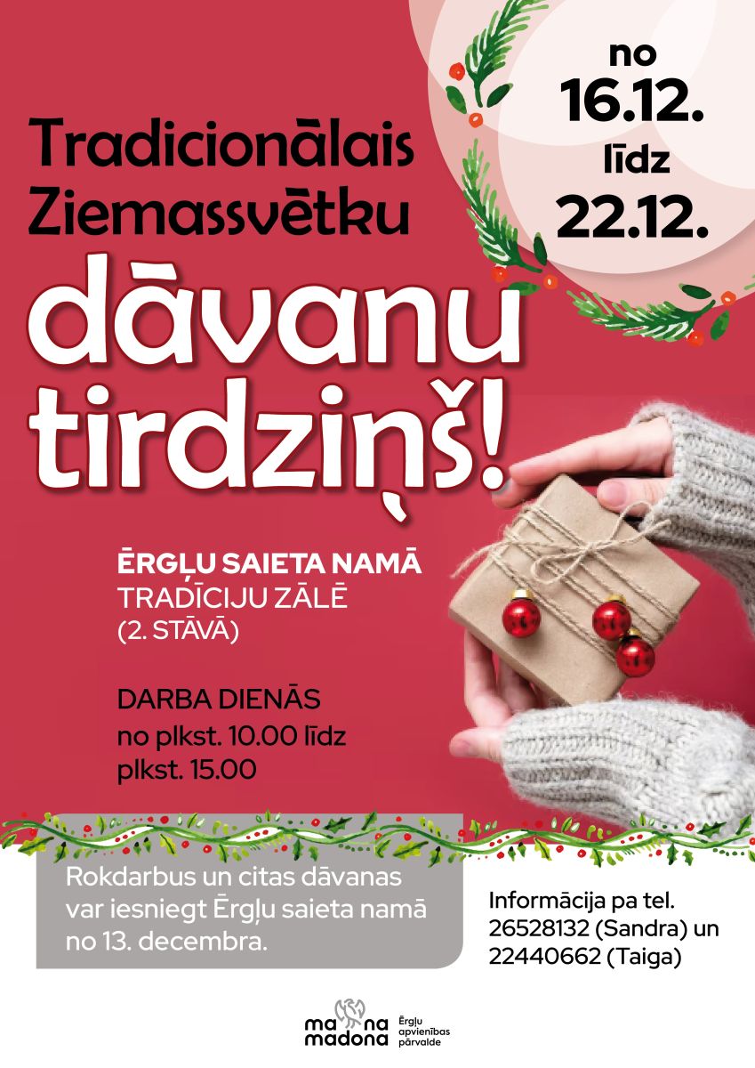 No 16.decembra līdz 22.decembrim TRADICIONĀLAIS ZIEMASSVĒTKU DĀVANU TIRDZIŅŠ ĒRGĻOS